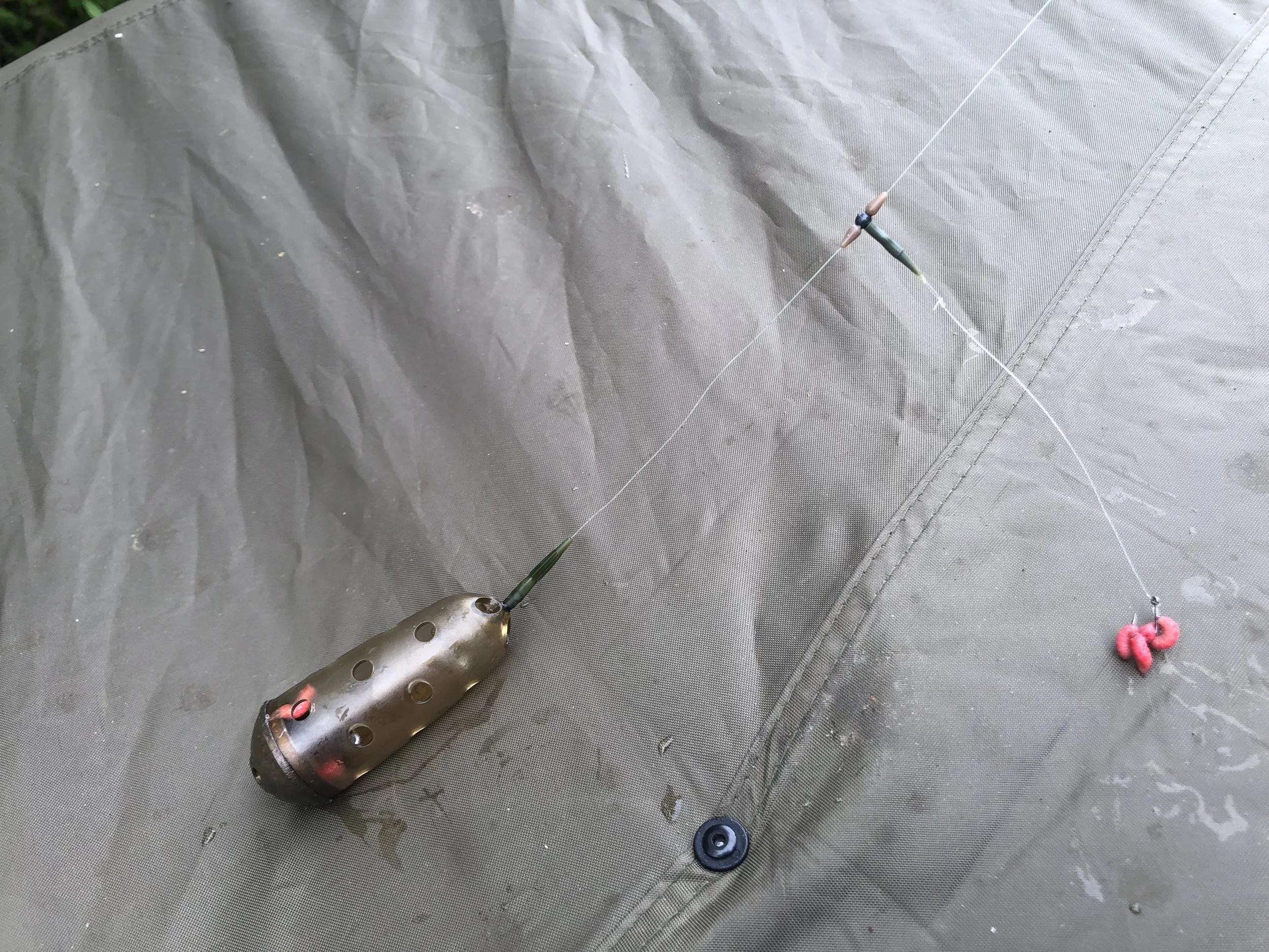 I got the leading rod to work and found the channel and gravel at 10.5 wraps. I set one rod up on a 70g method feeder and Pandemic wafter and used my special little Crucian ground bait mix. The other two were set up with heli-rigs, 2oz feeders, 5” Gardner fluorocarbon hooklinks to size 10 Talon Tip hooks baited with worm kebabs and maggots in the feeders.