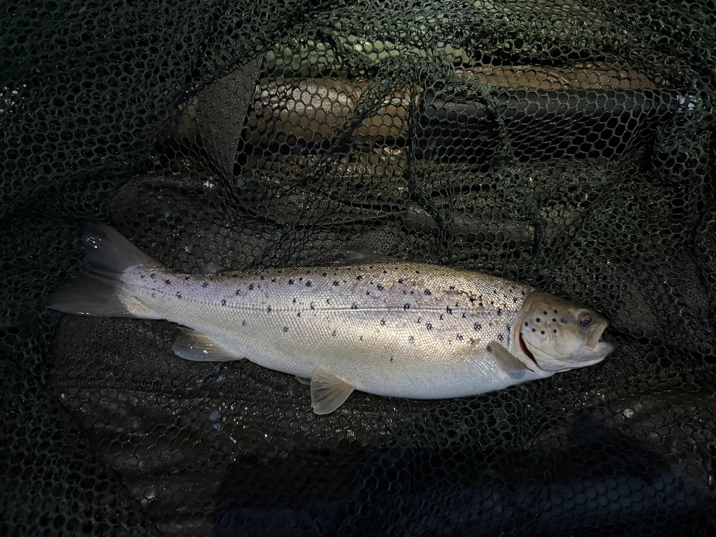 My set up was 4oz feeders, my usual combi-rig, only the braid section was replaced with a 3” section of 15lb Mirage to a size 8 Target Barbel hook with 10 real and one fake maggot directly on the hook. I put 10 spoppers each of hemp and maggot through the swim and finally sat back with a brew. On the second cast the right-hand rod flew round and sprang back, I reeled into check, the hook was sharp but maggots were missing so it was a pickup. I reloaded the feeder and recast and stood by the rod, it slammed round again and this time was hooked and I was hoping all my hard work and travelling had paid off and then quickly realised it hadn’t 😂, as a small Sea Trout popped up into the net.